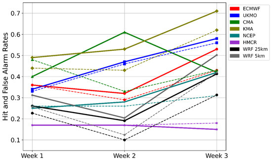 Hit rates (solid lines) and false alarm rates (dashed lines) of 850 hPa temperatures predicted by WRF (25 km and 5 km grid spacing) and the six meteorological centres for the initialization dates of 9–15 (week 1), 16–22 (week 2) and 23–29 (week 3) April 2020. Threshold used: 95th percentile of the 850 hPa temperature of ERA5 (1975–2005). The validation period was 8–23 May 2020 at 00 UTC of each day. All the forecasts and the ERA5 reanalysis were interpolated to the same grid (34.5° Ν–42° N, 19.5° E–29.5° E) with a grid spacing of 1.5° × 1.5°.
