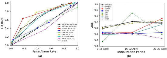 (a) ROC diagram of 850 hPa temperatures predicted by WRF (25 km and 5 km grid spacing) and the six meteorological centres for initialization dates of 23–29 April 2020. (b) Timeseries of the AUC scores across the three initialization periods (9–15, 16–22 and 23–29 April 2020). Threshold used: 95th percentile of the 850 hPa temperature of ERA5. The validation period was 8–23 May 2020 at 00 UTC of each day. All the forecasts and the ERA5 reanalysis were interpolated to the same grid (34.5° Ν–42° N, 19.5° E–29.5° E) with a grid spacing of 1.5° × 1.5°.