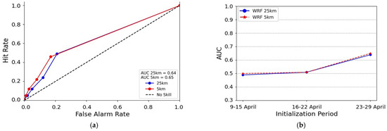(a) ROC diagram for the initialization period of 23–29 April 2020 (week 3) and (b) AUC scores for all three initialization periods (9–15, 16–22 and 23–29 April 2020) of the predicted maximum daily 2 m temperatures (T2max) for WRF (25 km and 5 km grid spacings). Threshold used: 95th percentile of the maximum daily 2 m temperature of ERA5. The validation period was 8–23 May 2020. All WRF forecasts and the ERA5 reanalysis were interpolated to the same grid (34.5° Ν–42° N, 19.5° E–29.5° E) with a grid spacing of 0.25° × 0.25°.
