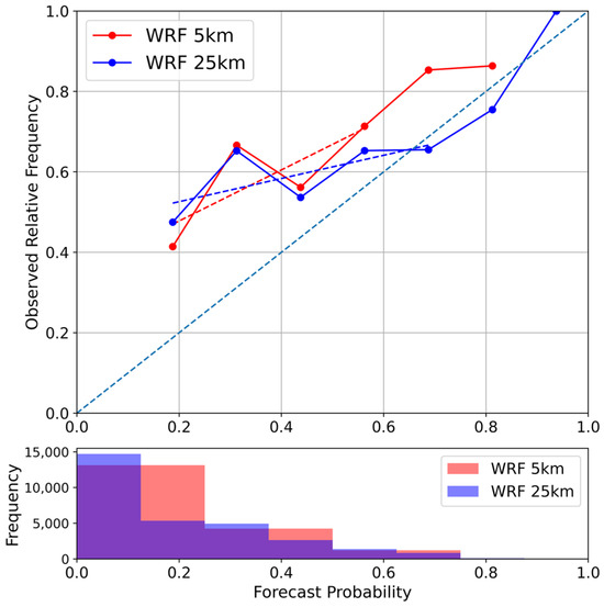 The ROC diagram in Figure 14a shows the performance of the deterministic forecasts of WRF 25 km (blue curve) and 5 km (red curve) for T2max from week 3. WRF 5 km showed a slightly better prediction performance (AUC = 0.65) compared to WRF 25 km (AUC = 0.64). In weeks 1 and 2, the models exhibited poor prediction abilities, as their AUC scores were 0.49 to 0.51 for both grid spacings (Figure 14b).