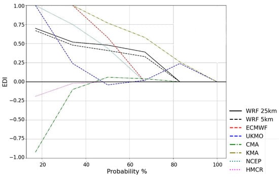 Finally, another statistical score that utilizes the hit rate (HR—Equation (5)) and false alarm rate (FAR—Equation (6)) is the extremal dependence index (EDI—Equation (7)) [88]. It is used to assess the association between the probabilistic forecasts and the observations. It stands out from the other scores, for example, the HR, because it is a non-degenerative measure of the predictability of rare binary events as the yes/no threshold for the heatwave for this study is the 95th percentile of air temperature. A perfect forecast has an EDI = 1 and an inaccurate forecast in S2S timescales has an EDI = 0.