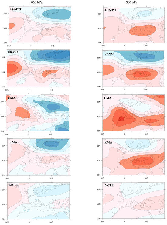 The global reforecasts from the S2S database were utilized in order to take into account the systematic biases of each model. The reforecasts were compared with the real-time forecasts of temperature at 850 hPa at S2S timescales when the forecast coincides with the reforecast initialization day. This is justified because some meteorological centres (ECMWF, CMA, HMCR and NCEP) produce reforecasts along with forecasts, but other centres (UKMO and KMA) produce reforecasts only four days per month (on the 1st, 9th, 17th and 25th) in addition to their daily production of forecasts. Anomaly Correlation Coefficients (ACCs) were calculated for each global model using its reforecasts [81]. Moreover, the reforecasts were compared with the ERA5 climatology data.