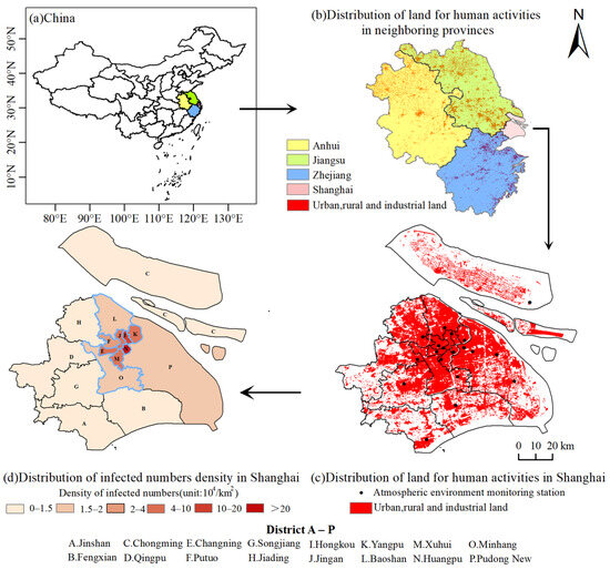 The overview map of Shanghai, China. There are four figures here. (a) is the administrative map of China, in which a small pink area means Shanghai, and its neighboring provinces are colored: Jiangsu province in green, Anhui province in yellow, and Zhejiang province in blue. (b) shows an enlarged view of these three neighboring provinces and their distributions of urban, rural, and industrial land, that is, the land mainly for human activities (the land use data was from the Chinese Academy of Sciences: https://www.resdc.cn/data.aspx?DATAID=360, accessed on 10 December 2023). The areas for human activities in Zhejiang, Anhui, and Jiangsu account for 9.38%, 10.09%, and 19.06% of the total areas of the corresponding provinces, respectively. (c) shows Shanghai’s distributions of urban, rural and industrial land and atmospheric environment monitoring stations. The symbol “·” in (c) represents the locations of the stations, totaling 19 in Shanghai. The area for human activities accounts for 43.02% of the whole of Shanghai. The overlap between the monitoring stations and areas of high human activity is evident in (c), as depicted in the blue box area in (d), encompassing 9 administrative regions including Baoshan, Jingan, Hongkou, Yangpu, Putuo, Changning, Huangpu, Xuhui, and Minhang, represented with letters L, J, I, K, F, E, N, M, and O, respectively, and the proportions of the land for human activities in each district are more than 43.02%. The letters A–P in (d) means the names of Shanghai’s 16 administrative districts (see the legend on the bottom in Figure 1). (d) shows the map of Shanghai’s administrative districts, with colors showing the distribution of COVID-19 infection density in spring 2022, i.e., the number of infections in one square kilometer the unit is 104/km2. The darker the color, the more people infected (the sum of the symptomatic and the asymptomatic); see the legend on the lower left. There were more than 60,000 confirmed cases and more than 540,000 asymptomatic infected people in this period.