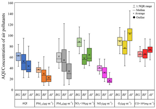 The AQI values and concentrations of air pollutants during the BG, BF, and AF periods in the spring of 2022. The AQI values and concentrations of PM2.5, PM10, SO2, NO2, O3, and CO are represented by blue, orange, gray, green, pink, yellow, and red, respectively, and there are three values in each group. Take the AQI values as an example; the first one from the left represents the AQI value during the BG period, followed by those during the BF and AF periods. In the figure, “×” indicates the mean value, and “-” is the median value.