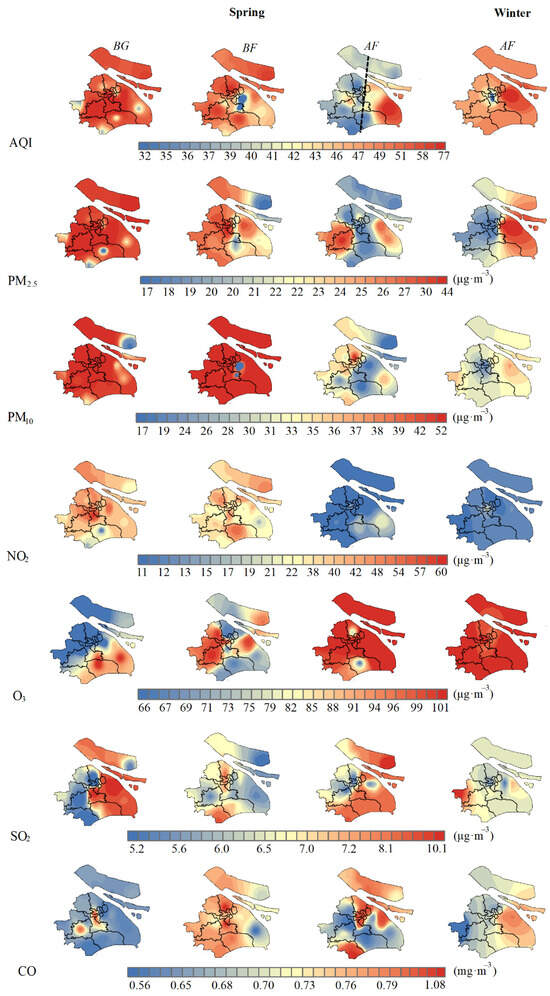 Spatial distribution of AQI values and concentrations of six primary pollutants in Shanghai. The first three columns, from left to right, mean: BG period, BF period, and AF period in spring 2022, respectively; the last one shows the distribution during the AF period in the winter of 2019. Each row from top to bottom means the distribution of AQI, PM2.5, PM10, SO2, NO2, O3, and CO, respectively. The units for PM2.5, PM10, SO2, NO2, and O3 are μg·m−3; CO is mg·m−3.