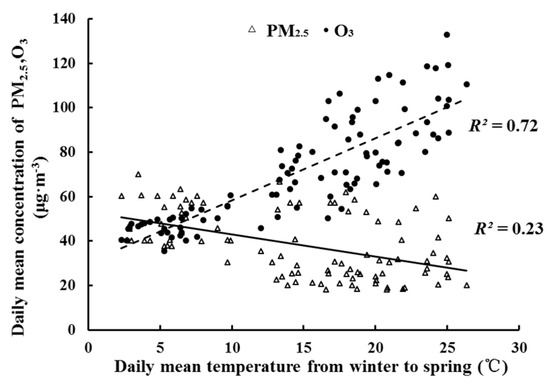 Daily mean temperature and PM2.5 (O3) scatter plots from winter to spring in Shanghai, covering the period from 26 January to 25 February (winter) and 28 March to 31 May 2021 (spring). A total of 96 fitting points were generated for the relationship between average daily temperature and PM2.5 (O3) concentration. The trend line of the relationship between temperature and O3 is a dotted line, and that between temperature and PM2.5 is a real line. Air temperature is measured in °C, while PM2.5 and O3 concentrations are measured in μg·m−3.