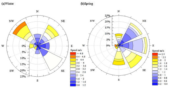 The historical meteorological data for Shanghai were from Songjiang Station in Shanghai (https://data.cma.cn/, accessed on 22 November 2022), with an hourly temporal resolution. To analyze the influence of the seasonal meteorological differences in winter and spring on the concentrations of air pollutants, we took the historical data for the same period during the winter and spring lockdown periods and calculated the daily mean values to represent the meteorological conditions, which include the air temperature, precipitation, wind speed, and wind directions. Here, wind direction and speed were represented by wind-roses diagrams to analyze the impact of monsoon changes on the spatial distribution of air pollutants under winter and spring lockdowns in Shanghai. The wind-rose diagrams showed 16 directions of wind, as well as the occurrence probabilities and wind speeds.