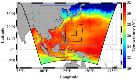 The HWRF coupled model domains. The region with SST is the outer HWRF domain. The blue box is the Northwest Pacific MPIPOM-TC domain. The black solid boxes inside show the sizes of the intermediate and innermost movable HWRF domains.