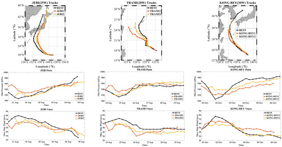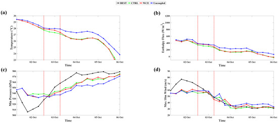 The subsequent weakening of the storm, starting at 1800 UTC 2 October, is consistent with the lower OHC levels (20–40 kJ/cm2) encountered by Kong-rey (Figure 8b and Figure 9c). This weakening corresponds to the pre-existing SST cooling caused by the preceding TC Trami [50], which is evident at 19–22.5° N, 128–131° E in the GFS SST and, especially, OHC at 1800 UTC 30 September (Figure 8). However, the weakening phase is not accurately simulated compared to the best track data (Figure 2), which is consistent with the results of [31]. This suggests that other factors, such as the storm’s size, may have a more substantial impact on storm intensity than the pre-existing cooling.