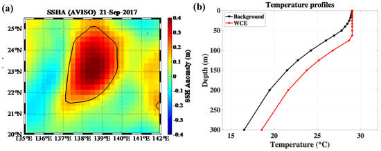 (a) AVISO sea surface height anomaly (m) on 21 September 2017. The eddy edges are enclosed by black lines. (b) Temperature (°C) profiles in the background (black line) based on GDEM climatology and the center of WCE (red line) based on the WCE observed during Typhoon Maemi.