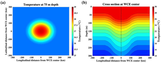 To create the 3D structure of the WCE, we followed the methodology described in [19]. The WCE is constructed by assigning a series of temperature profiles ranging from the background to the eddy center. In our experiments, the background temperature is determined from the temperature field at the end of the MPIPOM-TC initialization, at the location where the WCE is embedded. The temperature at the center of the eddy is specified from the WCE encountered by Super Typhoon Maemi, as described in [12]. These profiles are illustrated in Figure 3b. Figure 4 shows the temperature at a depth of 75 m within the created idealized eddy and a zonal vertical cross-section through the center in the upper 300 m. The current field is spun up by running the MPIPOM without wind forcing and assuming a fixed SST for approximately 96 h. By the end of the integration, the density and current fields are adjusted to achieve quasi-geostrophic balance. After the WCE is created, the temperature anomaly field is calculated by subtracting the background temperature. This field is then added to the temperature field at the end of the MPIPOM-TC initialization procedure.