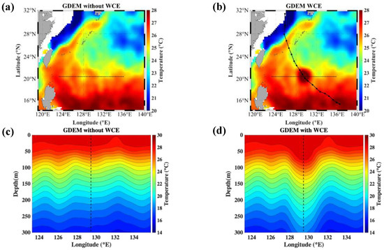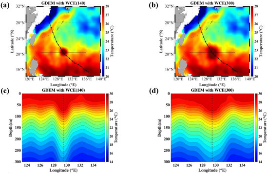 (a) Spatial distribution of temperature (°C) at 75 m in GDEM climatology, and (c) zonal vertical cross-section at 20.4° N along the dashed line in (a). (b,d) after WCE with 200 km radius assimilation into GDEM climatology for TC Kong-rey experiment initialized at 1800 UTC 30 September (KONG-REY1). BEST track and center positions of Kong-rey every 6 h are overlaid in (b). Vertical dashed line in (d) indicates the center of WCE.