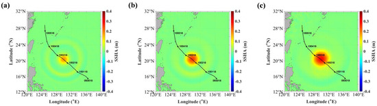 Spatial distribution of sea surface height anomaly (m) at 1800 UTC 30 September in the KONG-REY1 experiments (a) WCE (140), (b) WCE (200), and (c) WCE (300). SSHA is calculated from the model output (WCE–CTRL). Simulated track and center positions of Kong-rey every 6 h are overlaid.