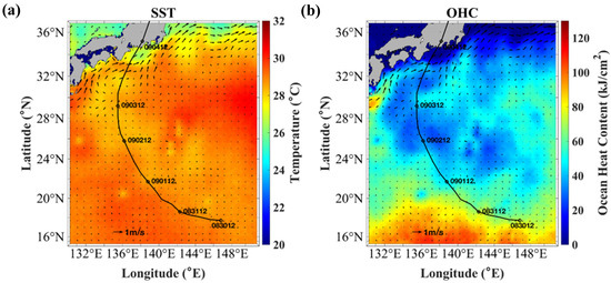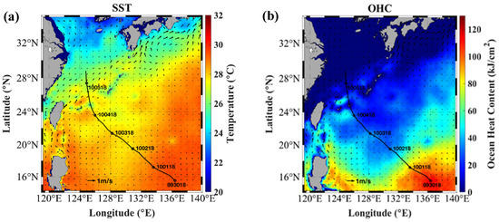 Spatial distribution of (a) SST (°C) and (b) OHC (kJ/cm2) with ocean currents for KONG-REY1 CTRL experiment at 1800 UTC 30 September. The storm track is shown by the black line.
