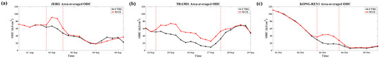Time series of area-averaged OHC (kJ/cm2) for (a) JEBI1, (b) TRAMI1, and (c) KONG-REY1. OHC is calculated within 100 km radius. Vertical red dashed lines indicate the time period when the storm passed over WCE.