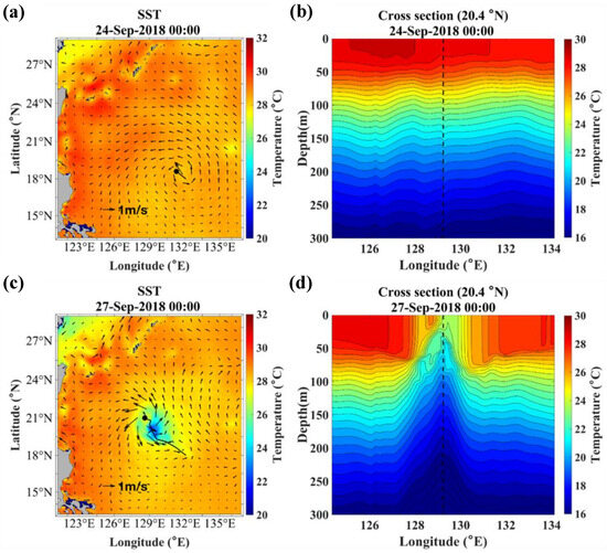 According to the JTWC best track data, Trami reached its peak intensity of 914 hPa at 1800 UTC 24 September and gradually weakened thereafter (Figure 2). This is consistent with our model simulation during Trami’s weakening phase. In the TRAMI1 CTRL experiment, initialized at 1800 UTC 23 September, the TC intensity significantly decreased between approximately 1800 UTC 24 September and 0000 UTC 27 September. This reduction was primarily due to Trami’s slow movement during this period, with a translation speed of 2–3 m/s, resulting in a large SST cooling. Figure 11 shows the spatial distributions of SST and zonal vertical cross-sections along 20.4° N at 0000 UTC 24 September (before the storm’s arrival) and 0000 UTC 27 September (during the storm). The maximum SST cooling reached about 6 °C just behind the storm center, which is in good agreement with the observations and model results from previous studies [31,33,34,35,36]. The slow propagation speed amplified the TC-driven ocean currents and vertical current shear, enhancing vertical mixing and the entrainment of colder water from the thermocline into the ocean surface layer. The relationship between the surface cooling rate and the storm’s translation speed has been extensively documented in early modeling studies [5]. The slow-moving Trami also caused strong upwelling near the storm center, as shown in the temperature cross-section in Figure 11d. The upwelling, driven by the divergence of the near-surface current induced by the TC’s cyclonic wind, brought deeper and cooler water closer to the sea surface, increasing the efficiency of vertical mixing and cooling of the SST. This effect often results in a rapid decrease in storm intensity [6].