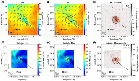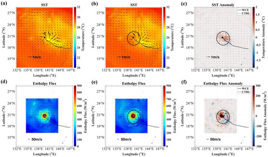 Spatial distribution of SST (°C) and enthalpy flux (W/m2) in (a,d) CTRL, (b,e) WCE experiments, and (c,f) anomaly (WCE–CTRL) for JEBI1 at 0600 UTC 1 September. The black circle indicates the location and approximate size of WCE, and the black dot indicates the storm center. The lines indicate the storm tracks in WCE and CTRL experiments.