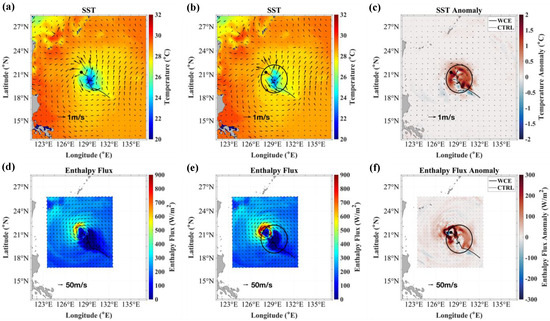 These figures were compiled at 0600 UTC 1 September in JEBI1 (Figure 12), 0600 UTC 27 September in TRAMI1 (Figure 13), and 1200 UTC 3 October in KONG-REY1 (Figure 14), representing the times the enthalpy flux differences between the WCE and CTRL experiments reached their maximum. The presence of WCEs has a significant impact on the SST response in all experiments. The SST anomalies calculated as WCE–CTRL (Figure 12c, Figure 13c and Figure 14c) show reduced SST cooling over WCEs, which resulted in increased enthalpy fluxes (Figure 12f, Figure 13f and Figure 14f). As expected, the magnitude of changes in the SST and enthalpy fluxes varies among the TC cases, depending on the specific storm characteristics and the pre-storm ocean conditions.