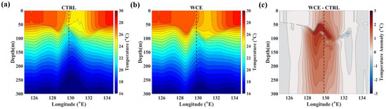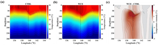 Zonal vertical cross section of temperature (°C) at the center of WCE in (a) CTRL, (b) WCE, and (c) anomaly (WCE–CTRL) for JEBI1 at 0600 UTC 1 September. Vertical dashed line indicates the center of WCE.