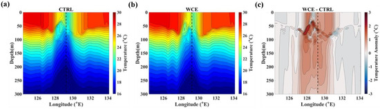 To examine the changes in the upper ocean thermal structure as the storm passes over the eddy, zonal vertical cross-sections through the storm center are compared in the CTRL and WCE experiments (Figure 15, Figure 16 and Figure 17). In the CTRL experiments, common features of the ocean response include the deepening of the mixed layer and a decrease in temperature. These changes in the upper ocean result from wind-induced vertical mixing, which is stronger to the right of the storm track due to the storm’s movement [5,6]. Another notable feature observed in the KONG-REY1 and TRAMI1 cases is the upwelling of cold thermocline water near the TC center, leading to enhanced cooling of the mixed layer. Trami produced the most significant upwelling due to its lowest translation speed among the three simulated TCs.