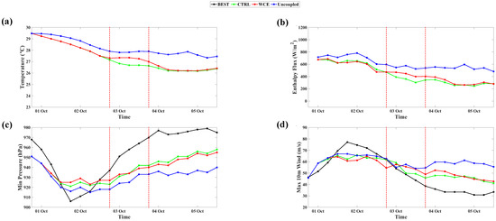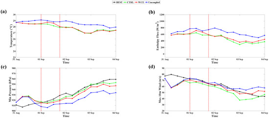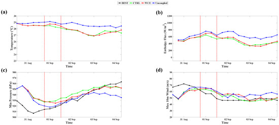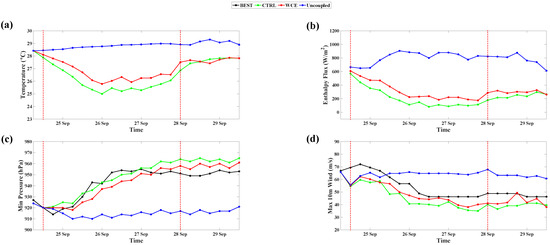 Figure 18, Figure 19, Figure 20, Figure 21, Figure 22 and Figure 23 show the minimum central pressures and maximum wind speeds in the uncoupled, coupled, and WCE experiments for all TC cases examined in this study: JEBI1, JEBI2, TRAMI1, TRAMI2, KONG-REY1, and KONG-REY2. As expected, the storm intensity in the uncoupled experiments is stronger in all TC cases than in the coupled experiments despite their following similar tracks (not shown). Note that [31] also found nearly identical track simulations in their coupled and uncoupled experiments. When the SST is fixed, it does not account for the SST cooling induced by storms, leading to an unlimited heat energy supply from the ocean for TC intensification. The largest differences in the TC intensity between the uncoupled and coupled experiments are found in Trami, which is the slowest-moving storm among the three simulated TCs. The slow movement of Trami allowed enough time to mix and cool the upper ocean beneath the storm and produced strong upwelling within the storm core area, as shown in Figure 16. This resulted in the largest differences in the averaged SST and enthalpy flux between the coupled and uncoupled experiments.