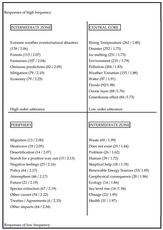 For the design of the questionnaire, the empirical data of previous surveys were considered, which reflect the views and attitudes of Greek and European citizens on climate change and environmental issues [41,42,43]. In stark contrast to other relevant surveys, the 27-question questionnaire included an open-ended question to quantitatively and qualitatively capture the social representation of climate change through the free-association technique. In addition, instead of a pre-selected list of possible responses, we recorded open-ended spontaneous responses of the survey participants, regarding the perceived importance of contemporary problems in Greece and worldwide.