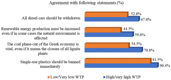 Therefore, high environmental concern does not necessarily imply people’s willingness-to-pay (WTP), i.e., giving up a part of their income for environmental protection. Individuals’ beliefs and perceptions regarding the potential consequences of a given measure for themselves seem to affect their WTP [23]. The intention of people to bear a cost for the environmental protection may also be influenced by product-related factors, such as the cost of green products and services, as well as various socio-economic and demographic drivers [33,34]. Gender may affect the WTP, but it does not seem to be a decisive factor [35,36]. Other socio-economic and demographic factors, especially age, income, and educational level, tend to affect more the intention of people to cover a part of the cost of climate mitigation and environmental protection. More specifically, younger individuals (20–39 years old) have been found to demonstrate a higher WTP compared to older ones (65+) [37], while the higher the income and the education level of respondents, the higher the WTP reported [31].
