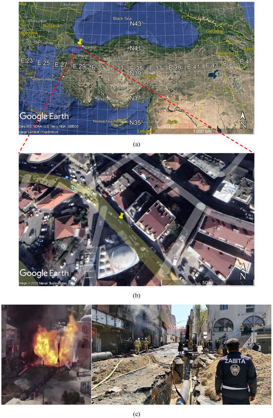 This study is very important because it is based on a real accident that occurred during natural gas distribution. In the literature, there are studies related to natural gas transmission and medium pressure distribution pipelines; however, this study mainly focuses on the consequences of accidents in local natural gas distribution pipelines and the role of resource emission factors and atmospheric conditions on gas transmission. For this reason, we analyzed a real natural gas distribution pipeline fire that occurred in the province of Istanbul as the basis. According to the records obtained from the Istanbul Metropolitan Municipality Fire Brigade Department and the news in the national press, the fire occured on 28 April 2020 at 11:07 a.m. local time (LT: UTC+3) in Beylikdüzü District Gürpınar Neighborhood İnönü Street [24]. From the relevant records, it is known that the construction machine used in the work during the excavation work on the street damaged the natural gas pipeline passing through the street; hence, the fire occurred as a result of the natural gas spreading to the environment contacting any open fire source. As a result, jet fire occurred in the urban settlement of Istanbul (Figure 1) and 15 people affected by the incident were treated by 112 emergency medical teams at the scene and 2 injured people were taken to the hospital by ambulance, which was published by Governership of Istanbul [25].