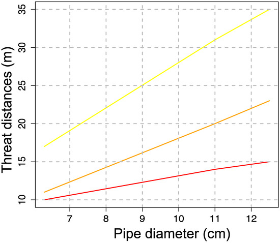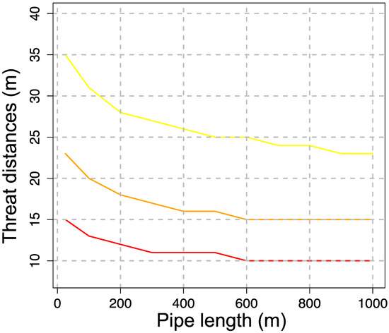 The pipe diameter was determined as 125 mm in the modeling studies carried out to determine the variation of the threat distances with the pipe length (the length of the pipe from the point of damage to the closure point). The calculated results for pipe lengths between 25 m and 1000 m are shown in Figure 2. In the investigated range, it was determined that the threat distances decreased non-linearly with increasing pipe length. For larger values of pipe length, it was found that threat distances do not change depending on the pipe length.