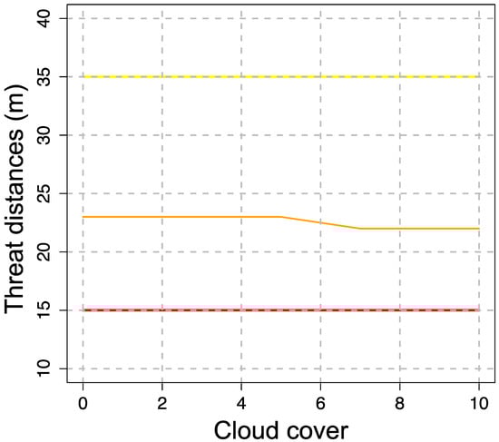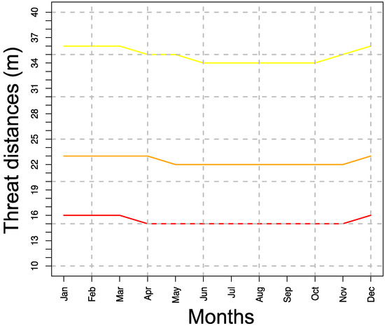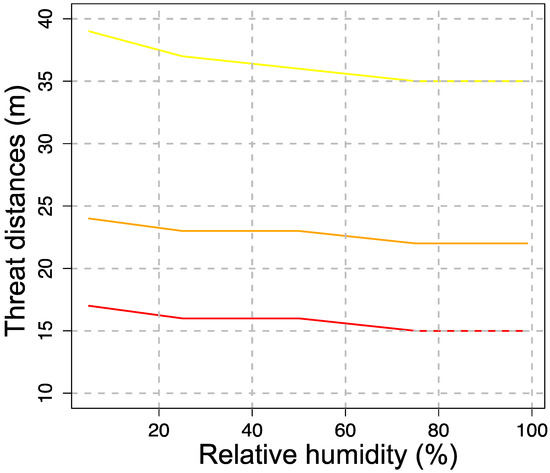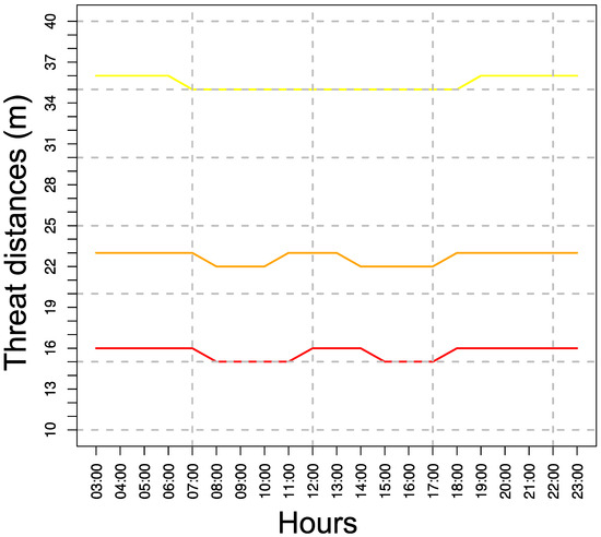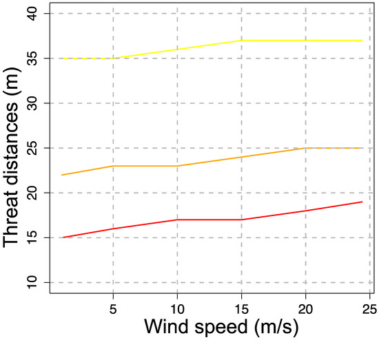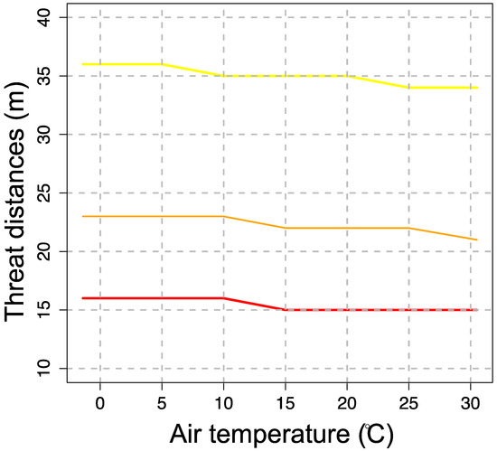 From the archieved records, the lowest and highest air temperature values change from −1.4 °C to 30.5 °C, respectively. Threat distances calculated for this range are shown in Figure 10. Threat distances decrease depending on the air temperature. However, for the entire range, it is observed that there is a change of 2 m in both yellow and orange threat distances and 1 m in the red threat distance.