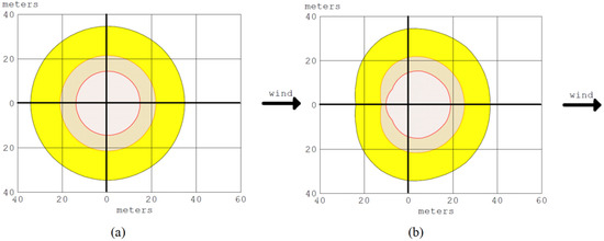 Threat zones calculated by ALOHA program for (a) low (1 m/s) and (b) severe (24.4 m/s) wind speeds.