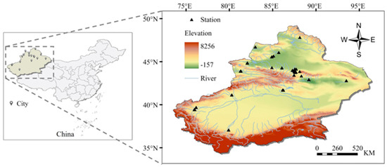 Xinjiang is located in northwestern China (73°40′ E~96°23′ E, 34°22′ N~49°10′ N), covering a total area of 1,664,900 km2. It is the largest provincial-level administrative region in China and accounts for approximately one-sixth of the nation’s total land area. The topography of Xinjiang is characterized by mountains and basins, with the Altai Mountains, Junggar Basin, Tianshan Mountains, Tarim Basin, and Kunlun Mountains, forming a “three mountains and two basins” landscape, in that order. The snow and glaciers from these mountain ranges converge to create over 500 rivers, predominantly distributed in the basins located to the north and south of the Tianshan Mountains. Xinjiang has a temperate continental climate characterized by substantial temperature variations and ample sunshine (annual sunshine duration ranging from 2500 to 3500 h). The climate is dry, marked by scarce precipitation (average annual precipitation of 150 mm). Influenced by the topography and spatial distribution of water resources, urban agglomerations in the region typically align in strip or ring formations, and the geographic distribution of environmental monitoring stations in Xinjiang is consistent with the distribution of cities (Figure 1). Cities and urban agglomerations play an important role in regional economic development, but air pollution has become an urgent problem in the region due to the intense human activities and fragile ecological environment.