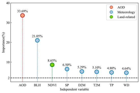 The variable importance test refers to the computation of the importance of each variable in model design [61]. In this study, RF is introduced to quantify the importance of variables. Following the variable selection strategy [62], variables with importance scores below 2% are excluded. As shown in Figure 4, the importance scores of all variables in this research exceed 2%, positively contributing to the estimation accuracy of the model. The most crucial variable is AOD (33.69%), which exhibits a high correlation with PM2.5 concentrations. Meteorological variables also play a significant role in PM2.5, particularly BLH (21.05%). The thick temperature inversion layer and low precipitation and BLH increase the air stagnation, stabilizing the polluted air over the area without diffusion [63]. A relatively high relative humidity favors the formation of secondary aerosols, a vital component of PM2.5 [64]. In addition, the land-related variables of the NDVI (8.65%) exhibit a considerable impact.