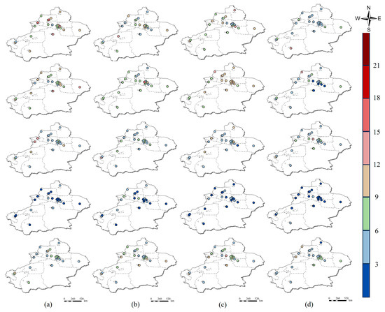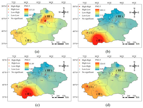 In the spatial dimension, Moran’s I statistical value of the annual mean PM2.5 concentrations at several stations in Xinjiang in 2021 was 0.71 (p < 0.001). Moreover, Moran’s I values for seasonal mean concentrations in summer (0.95), autumn (0.92), and winter (0.74) exceeded those for annual mean concentrations. This finding implies significant positive spatial correlation and aggregation of annual mean PM2.5 concentrations at multiple stations in Xinjiang. Seasonal datasets better reflected spatial aggregation changes. In addition, inverse distance weighting was applied to the mean PM2.5 concentrations for each season in 2021. During summer, autumn, and winter, Xinjiang exhibited a trend of higher PM2.5 concentrations in the southwest and lower concentrations in the northeast. Local Moran’s index statistics (Figure 6) indicate high–high clustering in the Kashgar (Ⅰ) and Hotan (Ⅱ) regions in southern Xinjiang during summer. Conversely, most areas in northern Xinjiang display low–low clustering in summer and autumn. Among them, the urban agglomeration on the northern slope of the Tianshan Mountain (Ⅲ) no longer follows this pattern in winter, showing elevated PM2.5 concentrations, gradually shifting to high–high clustering in spring.