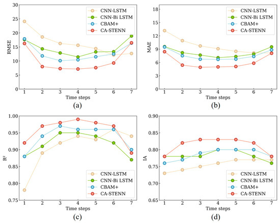 For multi-day forecasting, prediction accuracy generally increases and then decreases with the number of days, with models reaching peak accuracy around the fourth day (Figure 7). Averaging the prediction accuracies over the seven days, STWNN (RMSE = 10.29, MAE = 6.10, R2 = 0.96, and IA = 0.81) has the highest average prediction accuracy (Figure 8). Notably, STWNN (RMSE = 7.15, MAE = 4.19, R2 = 0.99, and IA = 0.83) has the highest prediction accuracy on the fourth day.