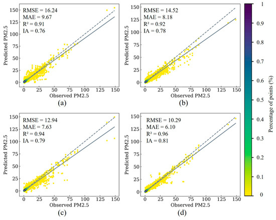 Overall forecasting scatter plots for (a) CNN–LSTM, (b) CNN–Bi-LSTM, (c) CBAM+, and (d) STWNN. The color of points represents the percentage of the total number of points in this value range. A higher percentage indicates that more data points are within this value range. The average value of multi-step prediction evaluation results is provided (N = 34134).