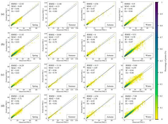 Seasonal forecasting scatter plots for (a) CNN–LSTM, (b) CNN–Bi-LSTM, (c) CBAM+, and (d) STWNN. N = 7728.