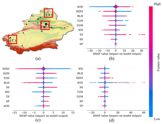 SHAP values for nine factors when predicting PM2.5 concentrations in different regions throughout Xinjiang ((a) the location of the selected stations, (b) station A, (c) station B, and (d) station C).