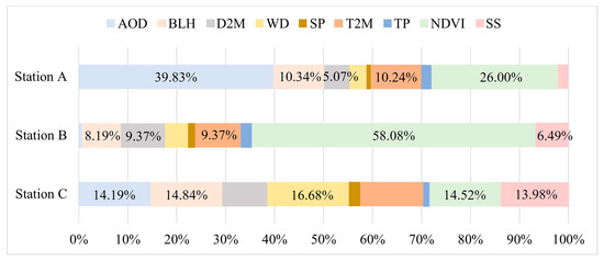 Figure 10 and Figure 11 illustrates the distribution of SHAP values for various feature variables at different stations concerning their contributions to PM2.5 in the overall predictions. Figure 10b indicates that station A is predominantly influenced by AOD (SHAP value = 1.14, contributing 39.83%), exerting a significantly positive impact on PM2.5. Elevated AOD levels forecasting increased vertical aerosol accumulation, resulting in atmospheric haziness and a subsequent increase in PM2.5 levels. The contributing factors as well as their corresponding SHAP values and percentage contributions are as follows: NDVI (SHAP value = 0.744 with a contribution of 26%), BLH (SHAP value = 0.296 with a contribution of 10.34%), T2M (SHAP value = 0.293 with a contribution of 10.24%), and D2M (SHAP value = 0.145 with a contribution of 5.07%). Figure 10c reveals that station B is mainly driven by the NDVI (SHAP value = 0.787 with a contribution of 58.08%), leading to a substantial negative impact on PM2.5. Therefore, relatively high vegetation cover promotes the absorption and deposition of PM2.5, resulting in a decrease in PM2.5 levels. Subsequent factors include D2M (SHAP value = 0.127 with a contribution of 9.37%), T2M (SHAP value = 0.127 with a contribution of 9.37%), BLH (SHAP value = 0.111 with a contribution of 8.19%), and SS (SHAP value = 0.088 with a contribution of 6.49%). Figure 10d indicates that station C is primarily influenced by WD (SHAP value = 0.154 with a contribution of 16.68%), resulting in a negative impact on PM2.5. Wind tends to bring abundant pollutants from the sand source given its proximity to the desert. The subsequent factors include BLH (SHAP value = 0.137 with a contribution of 14.84%), NDVI (SHAP value = 0.134 with a contribution of 14.52%), AOD (SHAP value = 0.131 with a contribution of 14.19%), and SS (SHAP value = 0.129 with a contribution of 13.98%). A relatively high SS value indicates a more substantial influence of surrounding stations on the focal point, with the positivity or negativity of the impact depending on the PM2.5 levels at the surrounding stations. This result aligns with the presented results in the figure. The contribution distribution of these aforementioned features indicates spatial heterogeneity between PM2.5 and the feature variables.