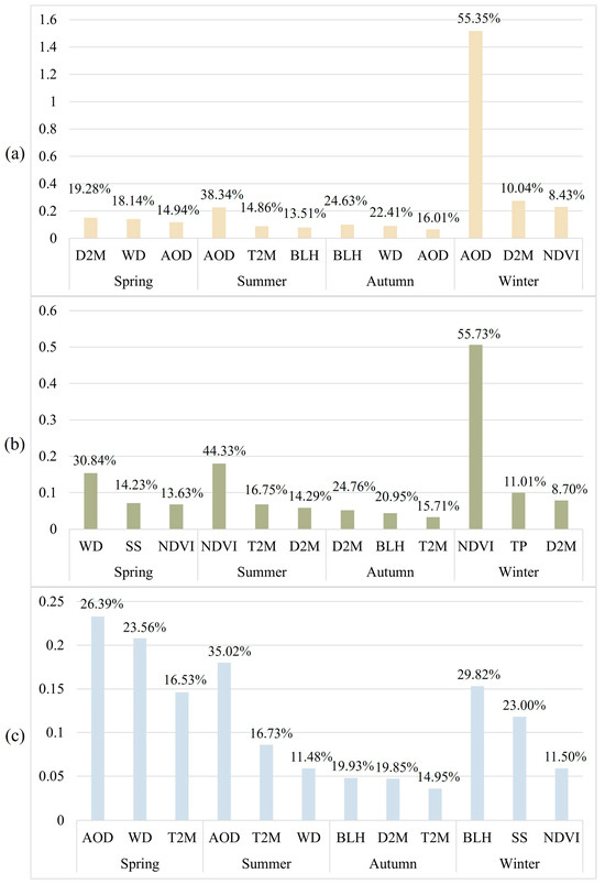 Station C is located in the southwestern part of Kashgar, surrounded by mountains on three sides and the Taklamakan Desert to the east, where floating dust lingers for an extended period and is not easily dispersed. Because of the windy, sandy and floating dust weather in this area in spring and summer, AOD has a significant impact on station C in spring (SHAP value = 0.233 with a contribution of 26.39%) and summer (SHAP value = 0.180 with a contribution of 35.02%), followed by WD and T2M because of the windy, sandy, and floating dust weather in this area in spring and summer. In addition, BLH has a greater impact on the area, where station C is located in the autumn (SHAP value = 0.048 with a contribution of 19.93%), followed by D2M and T2M with contributions of 19.85% and 14.95%, respectively. In winter, BLH (SHAP value = 0.153 with a contribution of 29.82%) is also the largest dominant factor, followed by SS and NDVI, with contributions of 23.00% and 11.50%, respectively. These characteristics are consistent with the top five dominant factors with closer contributions in the overall prediction of the previous section.
