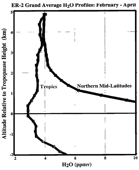 Average water vapor profiles in the tropics and in northern midlatitudes during the late winter/spring period when the tropical tropopause is coldest. The data are from ER-2 take-offs and landings 1987–1996 at Darwin and Panama (tropics), and from Moffett Field; Bangor, Maine and Wallops Island (midlatitudes). It is apparent that the air in the lowest 5 km above the tropopause has not been dried exclusively in the tropics. After Ref. [19].