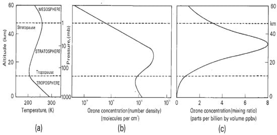 (a) Typical temperature profile. (b) Typical ozone number density profile. (c) Typical mixing ratio profile. The contrast between (b,c) shows why the greatest contributions to the total overhead ozone column arise from altitudes below 25 km, depending on latitude; the number density profile shows where the greatest contribution to the overhead column amount is located. The maxima in the profiles in (b,c) slope downwards from the tropics toward the poles. Profiles of DU (Dobson Units) per km are in Figure 4 of Ref. [20].