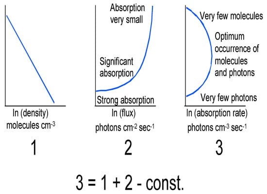 (1) is the logarithmic density profile. (2) is the solar flux and (3) is the resulting absorption rate to produce ozone. The result is a mixing ratio profile peaking at about 30 km, while the number density profile peaks lower down at about 20–25 km in midlatitudes, see Figure 2. After Ref. [21].