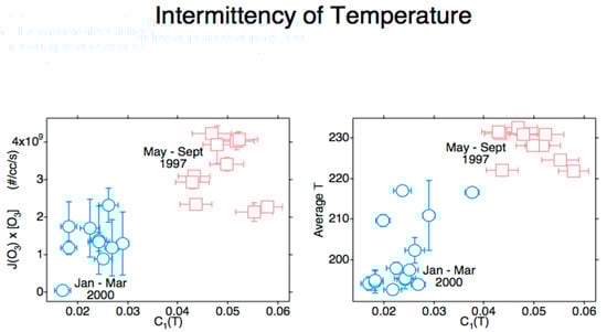 It was by now apparent that the full annual cycle of the chemical composition of the polar lower stratosphere was required, resulting in the Photochemistry of Ozone Loss in the Arctic Region in Summer (POLARIS) mission from Fairbanks (65° N, 148° W) in 1997 [133,134]. The results from the ER-2 and balloon profiles agreed with NOx-driven loss, as reported from ozone column observations in Ref. [75] for the Antarctic summer, albeit with a much better characterization of chemistry, radiation and transport. The inclusion of a radiometer on the ER-2 enabling the calculation of the ozone photodissociation rate, J[O3], ref. [135] produced an unexpected result: the positive correlation between that rate and the intermittency of temperature under statistical multifractal analysis [136], when combined with the results from the SAGE-III Ozone Loss and Validation Experiment (SOLVE) mission in the 1999–2000 winter [137], see Figure 4. This was an indication that hot photofragments were not instantaneously thermalized to a Maxwell–Boltzmann probability distribution.