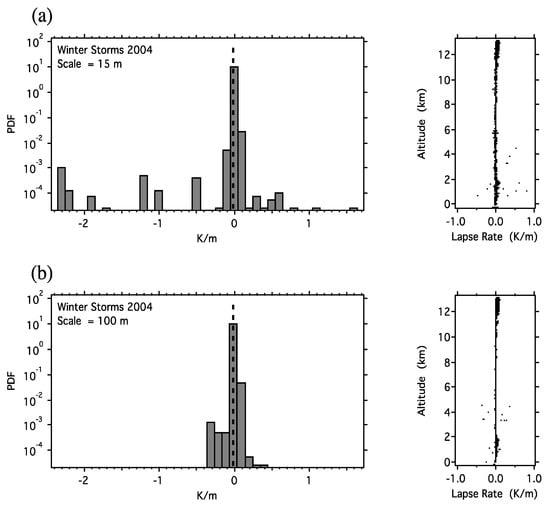 Change in temperature with altitude (the lapse rate). The dry adiabatic lapse rate (DALR) is 9.8 K/km and is marked by the vertical dashed line. The data are from Winter Storms 2004 [159,160] and were calculated for (a) a vertical interval of 15 m and (b) a vertical interval of 100 m. In (a), about 1% of the cases exceed the dry adiabatic lapse rate, whereas in (b), none do. The tropopause is discernible at vertical resolutions above 30 m using this criterion, but not below it. The 50% exceedance of the DALR is, by extrapolation, at 93 cm. Note that fluid flow emerges from a simulated molecular dynamics population of Maxwellian billiards in an asymmetric environment on very short time and space scales [165,166].