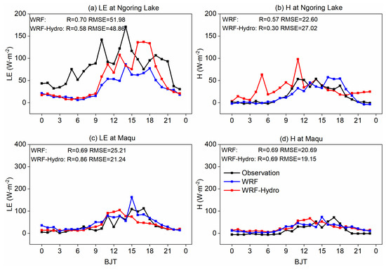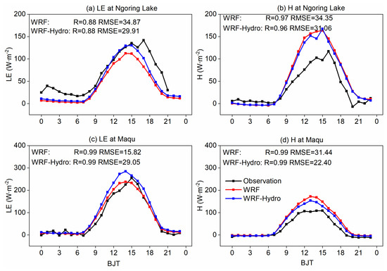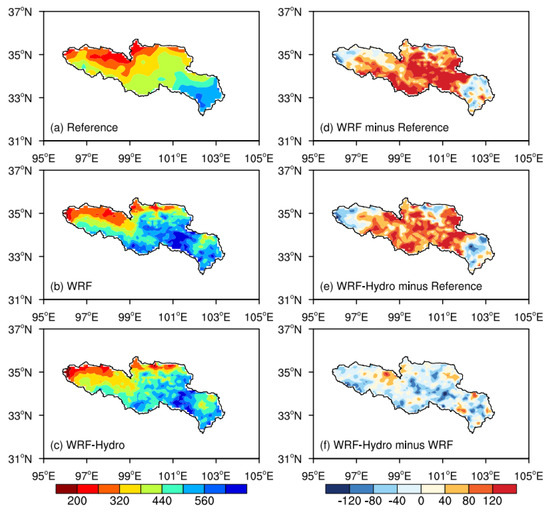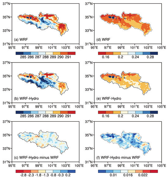 - Both the standalone WRF and coupled WRF-Hydro models indicate reasonable performance in reproducing variables associated with atmosphere–land–hydrology processes over the SRYR. The consideration of soil water lateral flow in the coupling process significantly reduces biases in water–heat exchange fluxes, soil temperature, and soil moisture simulations, with mean RMSE values of 32.27 W·m−2, 24.91 W·m−2, 4.22 K, and 0.06 m3/m3, respectively.
