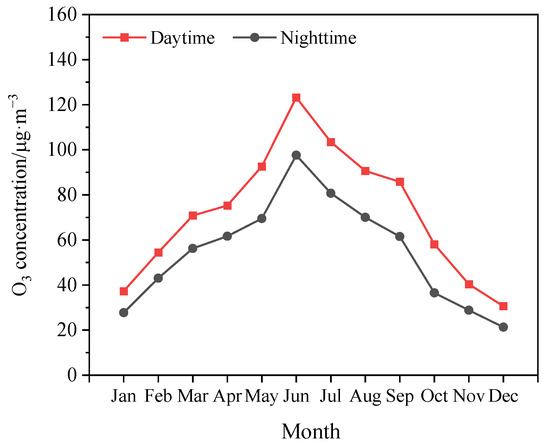 From 2022 to 2023, the monthly variation in nocturnal ozone concentration in Dongying showed a unimodal distribution, with the peak occurring in June (Figure 3). During January, February, October, and December, nocturnal ozone concentrations were relatively low, with monthly averages ranging from 17 to 45 μg/m3. In contrast, from March to September, the nocturnal ozone concentrations were higher, with monthly averages ranging from 52 to 100 μg/m3. This was consistent with the monthly variations in MDA8-O3 in Dongying, which showed that the ozone concentration was higher in the ozone pollution season (from April to September), while the ozone concentration was lower in the non-ozone pollution season (other months) [35]. It can also be observed that the ozone levels in Dongying during nighttime and daytime exhibit relatively similar monthly variations (Figure 3, Figure 4 and Figure 5). This finding is also supported by research by He et al. (2022). The nocturnal ozone concentration was higher in the ozone pollution season and lower in the non-ozone pollution season, indicating that the nocturnal ozone concentration was closely related to the daytime ozone pollution.