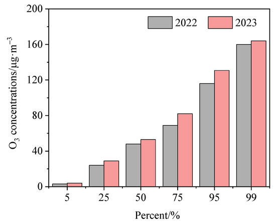 The different percentiles of the nocturnal ozone hourly concentrations increased in Dongying from 2022 to 2023 (Figure 6). Compared to 2022, the nocturnal ozone concentrations increased at different percentiles in 2023 from high to low as follows: 15 μg/m3 (95th percentile), 13 μg/m3 (75th percentile), 5 μg/m3 (50th and 25th percentiles), 4 μg/m3 (99th percentile), and 1 μg/m3 (5th percentile). It can be seen that the high and middle percentiles of the nocturnal ozone concentration increased most obviously in Dongying from 2022 to 2023. The increase in nocturnal ozone concentrations in Dongying is similar to the results of Li et al. (2023), who found that nocturnal ozone concentrations increased in most regions of China in the summer of 2019 compared to 2015, which was mainly caused by a reduction in both the ambient NO2 concentration and wet scavenging in recent years [15].