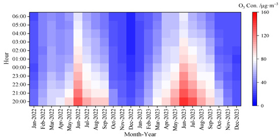 From 2022 to 2023, the nocturnal ozone peak in Dongying gradually decreased from 21:00 to 6:00 of the next day (Figure 12). During the study period, the nocturnal ozone peak was higher from 21:00 to 23:00, with an average value of 81 μg/m3. From 0:00 to 6:00, the nocturnal ozone peak changed slightly, and the average nocturnal ozone peak was 60 μg/m3. This is consistent with the results of Wu et al.’s research in the Pearl River Delta in China, which showed a gradual decreasing trend in nocturnal ozone peak from 21:00 to 6:00 of the next day [24].