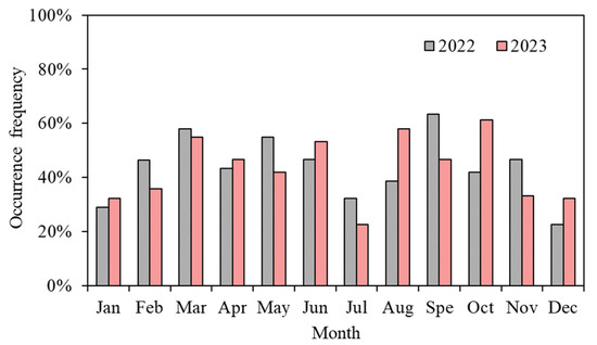 NOE events in Dongying from January 1, 2022 to December 31, 2023 were selected. The results showed that the annual average frequency of NOE events was 44% and 43% in Dongying in 2022 and 2023, respectively. This is comparable to the results of He et al.’s research on the frequency of NOE events in China [14]. The NOE events may be attributed to the nocturnal transport of high ozone concentrations from upwind cities, the downward transport of ozone from the night residual layer, and some specific meteorological processes, such as low-level jet streams, convective storms, and local circulation [14,24,25,26,27,45,46]. Overall, the frequency of NOE events in Dongying was higher in spring, summer, and autumn and lower in winter from 2022 to 2023 (Table 1 and Figure 8). The frequency of NOE events from February to March, May, July, September, and November in 2023 decreased compared with 2022, while the frequency in January, April, June, August, October, and December in 2023 increased compared with 2022, and the largest increase was in August and October. This might be related to changes in pollutant emissions and meteorological conditions in Dongying.
